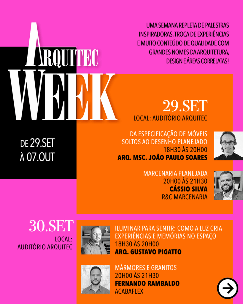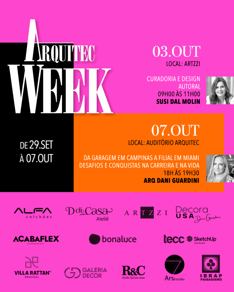 Durante uma semana, o público terá acesso a palestras exclusivas, trocas de experiências e muito networking com grandes nomes da arquitetura, do design e de áreas correlatas.