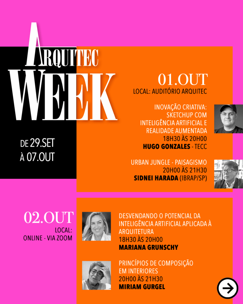 De 29 de setembro a 07 de outubro de 2025, acontece o Arquitec Week 2025, um evento que promete transformar a forma como arquitetos, designers e profissionais criativos se conectam com o mercado.